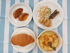 今日の献立は、パン・グラタン・ツナサラダ・白花豆の煮付け・たたきごぼう・柿