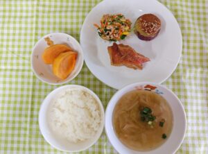 今日の献立は、ごはん・赤魚の煮付け・野菜の納豆和え・さつま芋田楽・レタスとベーコンのスープ・柿