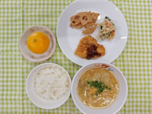 今日の献立は、ごはん・とんかつ・白和え・れんこんのきんぴら・キャベツの味噌汁・みかん
